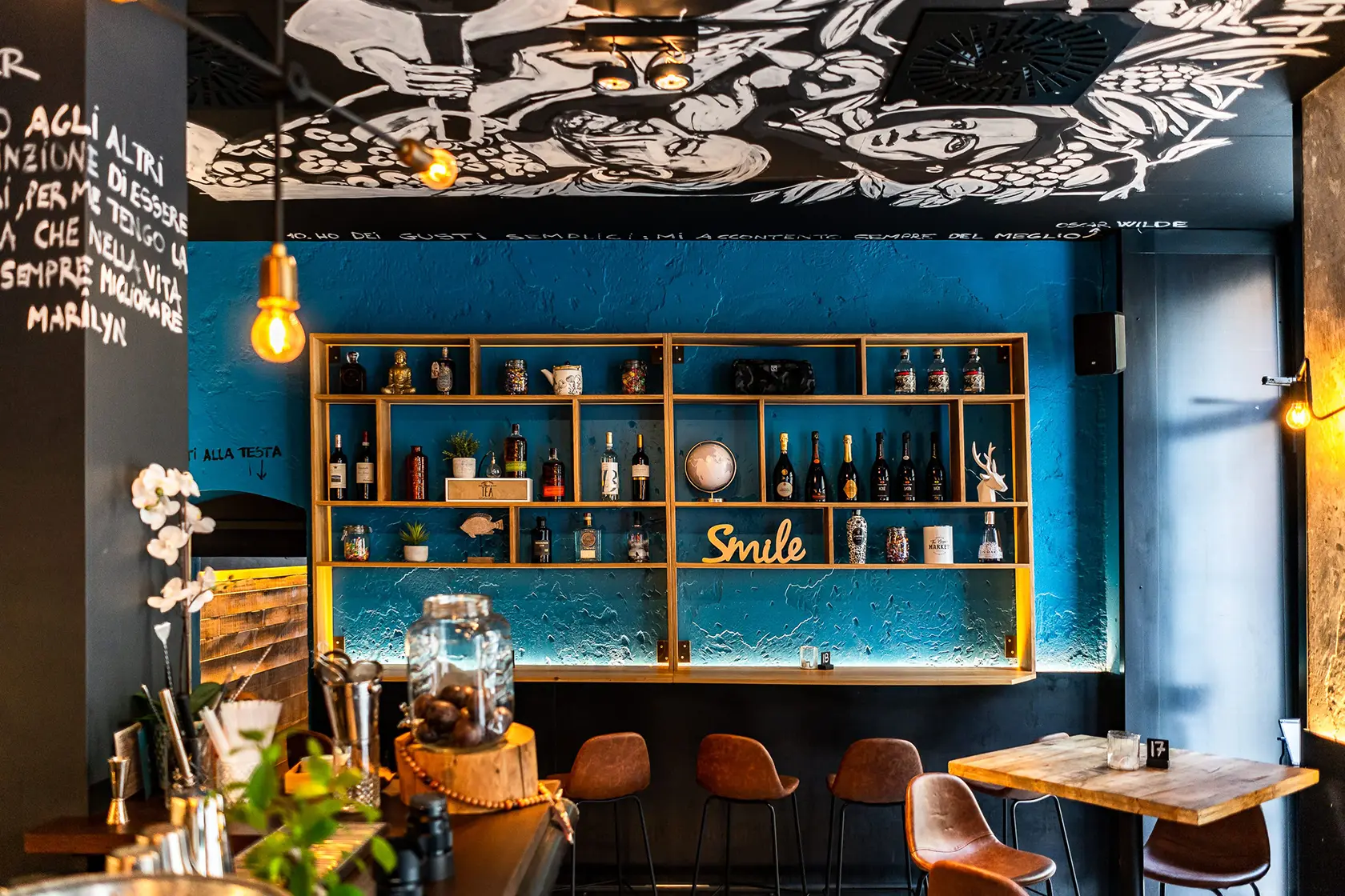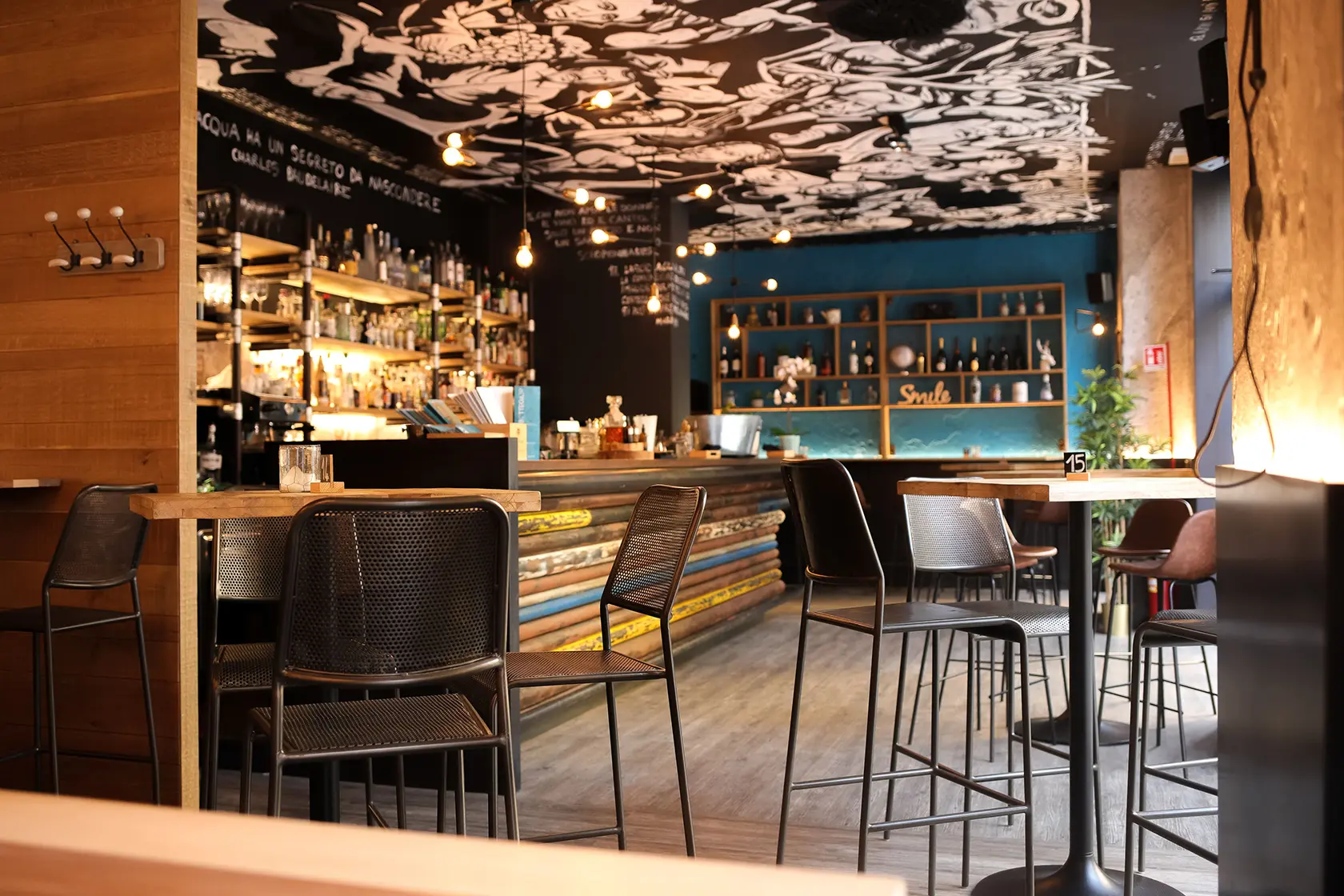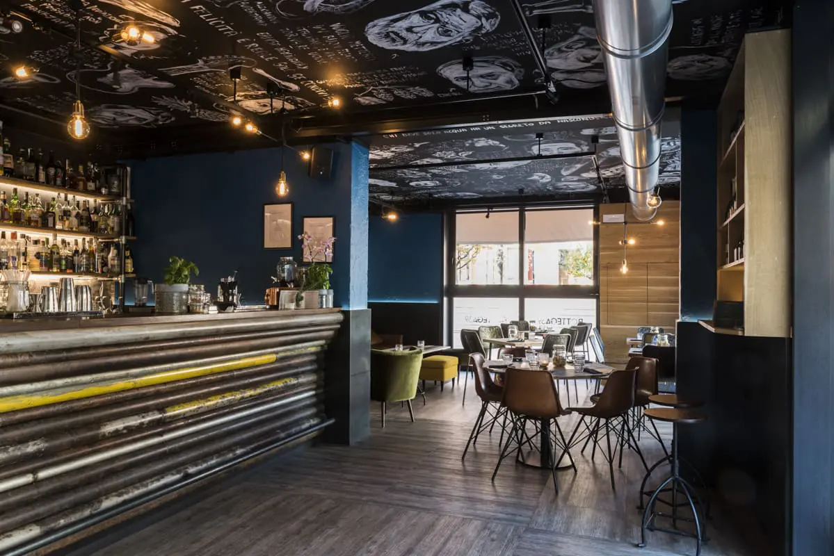 In Bottega 39 abbiamo lasciato che fossero proprio i materiali – ferro, legno e cemento – a parlare, con la loro texture ruvida e non trattata, i colori vissuti, le tracce del tempo. Il lungo bancone centrale, realizzato con vecchi tubi colorati, non è solo un elemento funzionale: è una dichiarazione di stile, un simbolo della volontà di dare dignità e bellezza anche all’imperfetto, al recuperato, al non convenzionale. Tutti gli arredi e le strutture sono stati costruiti per durare, ma anche per emozionare. Ogni graffio, ogni saldatura a vista, così come il soffitto dipinto a mano, racconta il valore di un lavoro autentico, artigianale, profondamente umano. È così che abbiamo interpretato la visione di Bottega 39: dando forma a uno spazio che non ha paura di mostrarsi vero.