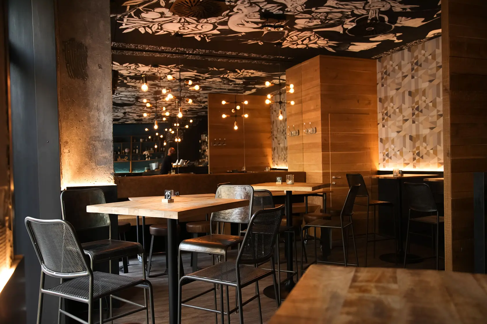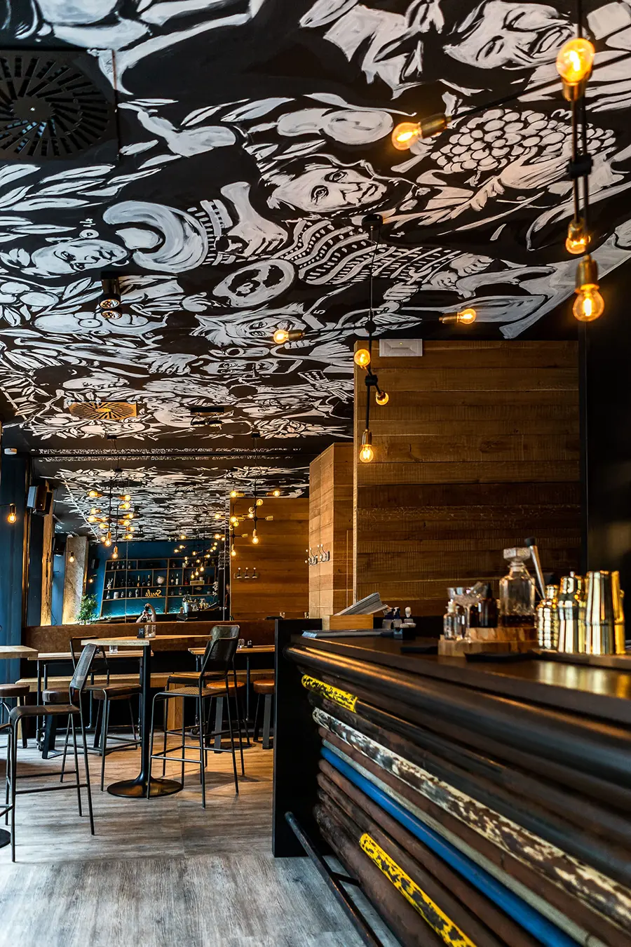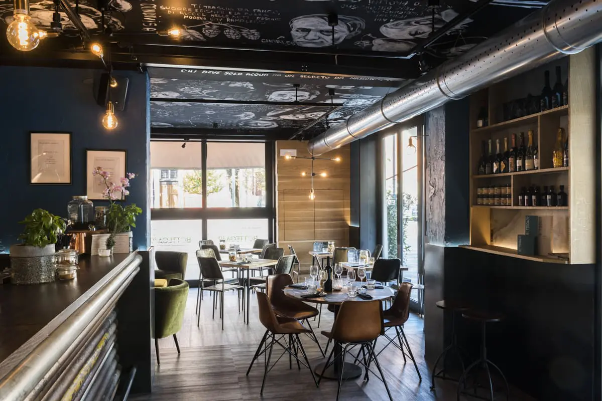 In Bottega 39 abbiamo lasciato che fossero proprio i materiali – ferro, legno e cemento – a parlare, con la loro texture ruvida e non trattata, i colori vissuti, le tracce del tempo. Il lungo bancone centrale, realizzato con vecchi tubi colorati, non è solo un elemento funzionale: è una dichiarazione di stile, un simbolo della volontà di dare dignità e bellezza anche all’imperfetto, al recuperato, al non convenzionale. Tutti gli arredi e le strutture sono stati costruiti per durare, ma anche per emozionare. Ogni graffio, ogni saldatura a vista, così come il soffitto dipinto a mano, racconta il valore di un lavoro autentico, artigianale, profondamente umano. È così che abbiamo interpretato la visione di Bottega 39: dando forma a uno spazio che non ha paura di mostrarsi vero.